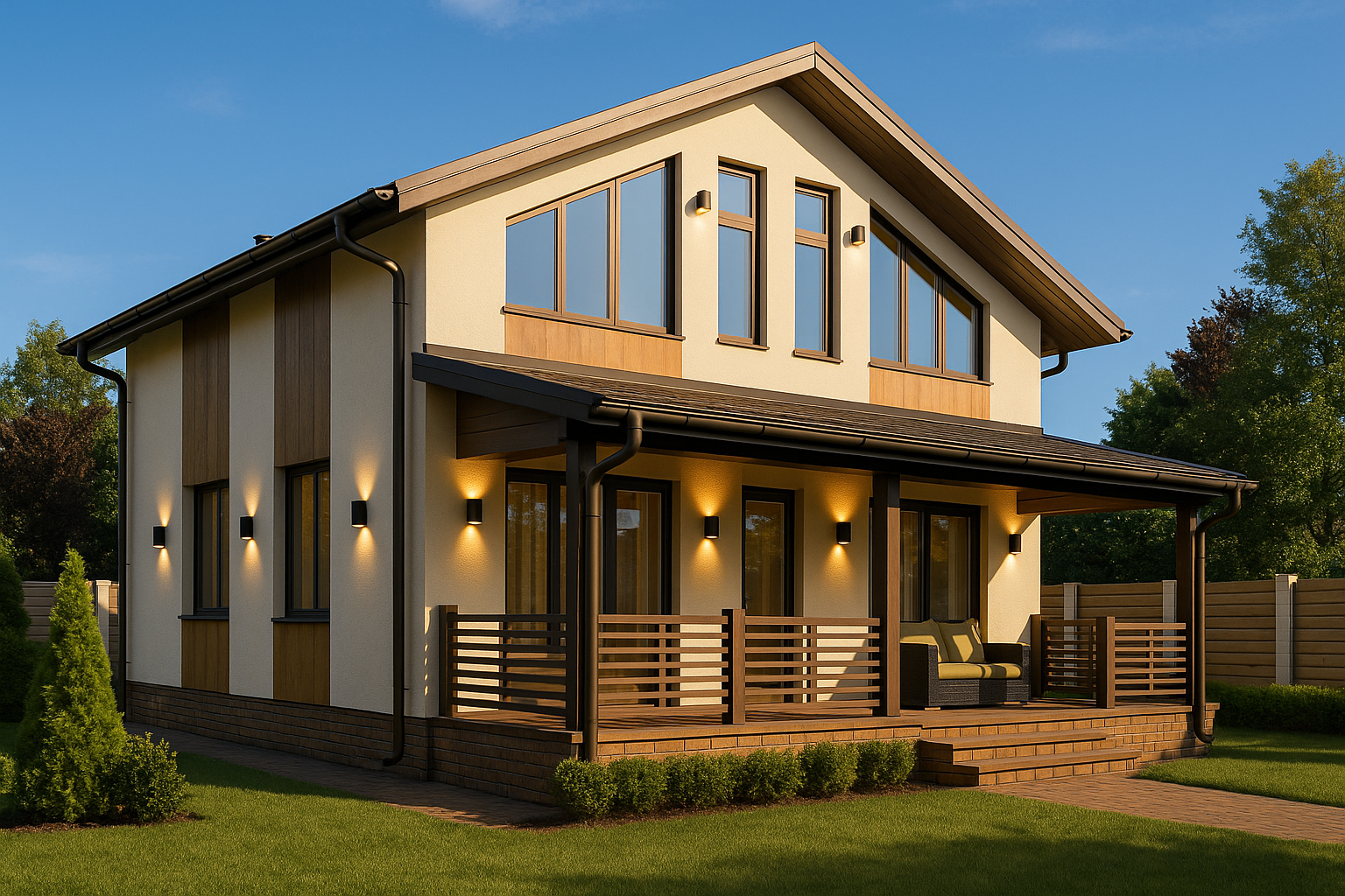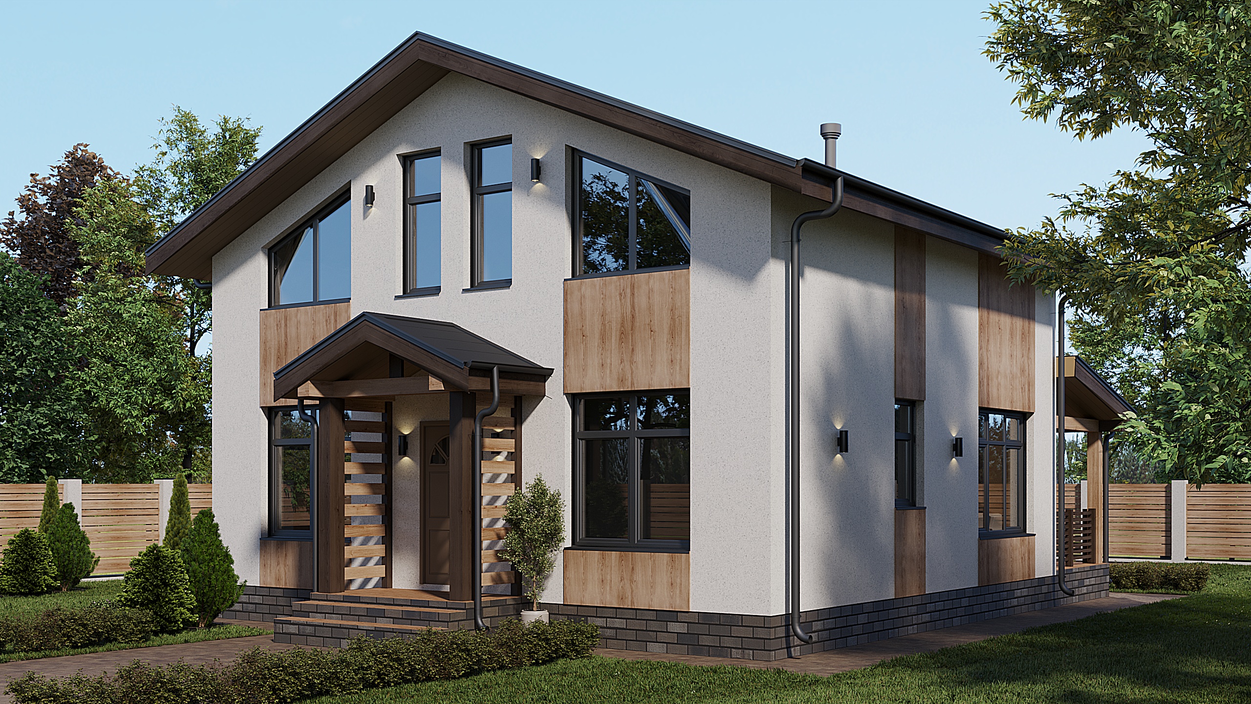 Виктория — это современный двухэтажный дом с выразительным силуэтом, скатной крышей и гармоничным фасадом, где классика загородного стиля сочетается с современными акцентами. Чистые линии, комбинированная отделка и панорамные окна формируют элегантный облик, который выглядит одинаково актуально как в сосновом лесу, так и на ровном участке в коттеджном посёлке.